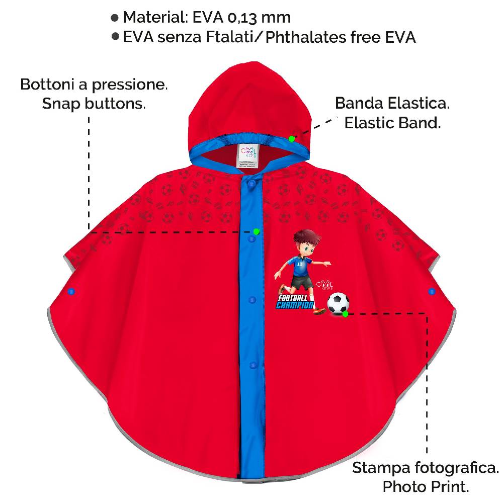 Età: 3/6 Anni.Un must-have per tutti i bambini fan di uno degli sport più amati!Mantellina impermeabile rossa con dettagli blu e stampa calciatore. Ideale per tutti i bimbi amanti dello sport e del calcio. Il poncho si presenta in forma arrotondata con bottoni a pressione per facilitare l'apertura frontale e un cappuccio antivento. Il tessuto è EVA, conforme alle normative di sicurezza e privo di sostanze tossiche. I dettagli riflettenti consentono di essere visibili anche al buio, assicurando il massimo della sicurezza. Disponibile in un'unica taglia, è ideale per bambini dai 3 ai 6 anni. Un accessorio da non lasciarsi scappare!