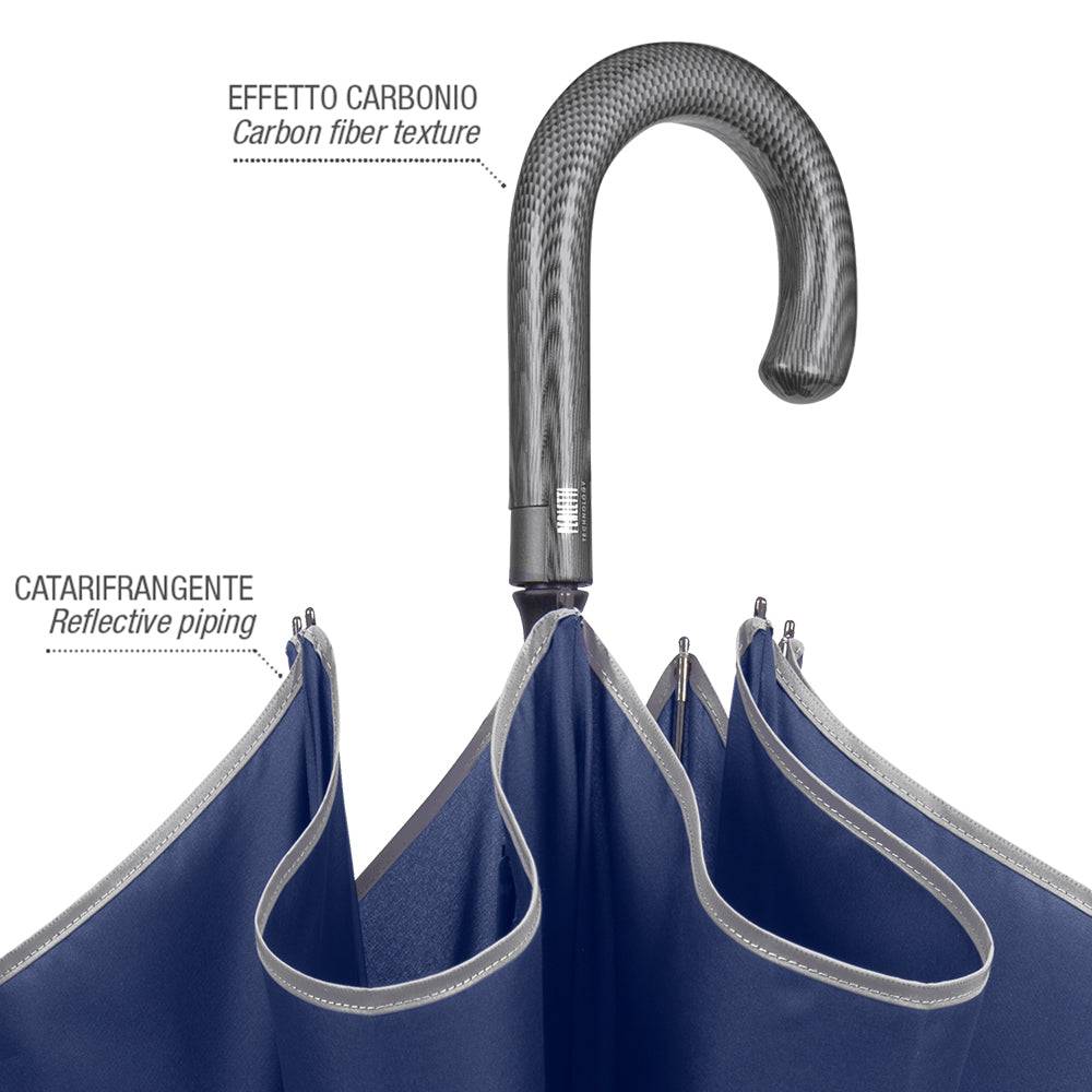 Ombrello extralarge unisex ultraleggero di colore blu. Innovativi profili catarifrangenti che lo rendono super sicuro soprattutto durante le passeggiate nelle ore più buie. Dotato di struttura antivento con asta e bacchette in fibra di vetro che rendono l'ombrello resistente e super flessibile. Tessuto a trama fitta con speciale resinatura che garantisce un'asciugatura super rapida. Apertura automatica azionabile dall'impugnatura con manico curvo ad effetto carbonio.